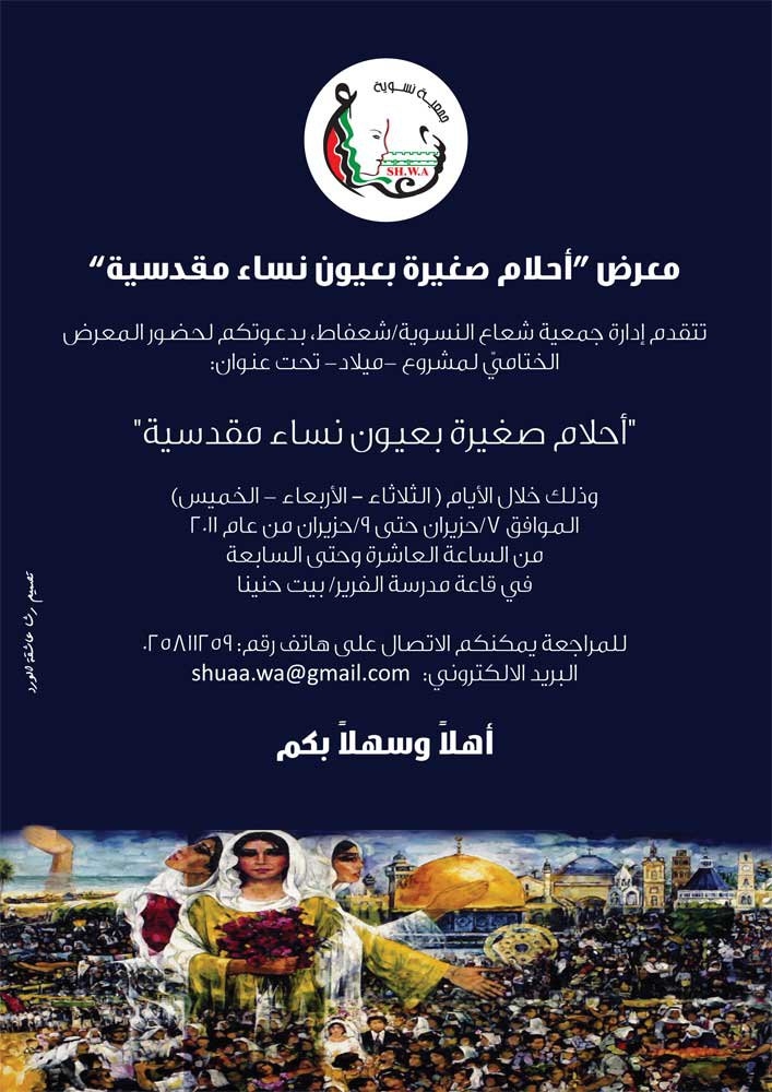مما يذكر أنني من قمت بتصميم دعوة الحضور، كل الشكر والتقدير لأرجوان للتصميم المشرف على تنفيذ الدعوة - رام الله. كما استخدمت إحدى لوحات الفنان الفلسطيني اسماعيل شموط رحمه الله، لما فيها من صور لامعة تعكس صورة المرأة المقدسية وتؤكد على المسؤولية التي يجب أن تحملها وتؤديها بأكمل وجه.