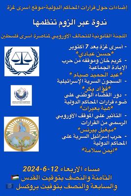 ] مشاركتي في ندوة اللجنة القانونية للتحالف الأوروبي لمناصرة أسرى فلسطين بعنوان "إضاءات حول قرارات المحاكم الدولية-موقع أسرى غزة" يوم الأربعاء 12.06.2024.