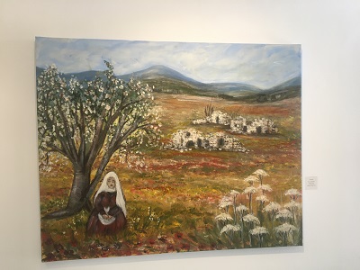شدّتني لوحة "حكاية وطن" للفنّانة نجية أحمد ياسين(أكريليك على قماش)؛ عبارة عن رسمة تعبيريّة انطباعيّة تحكي حكاية من حكايات الوطن، تصوّر ألم فقدان البيت والوطن، النزوح واللجوء، ألم الضياع مع إزهار ربيعيّ دافئ يبعث الأمل.