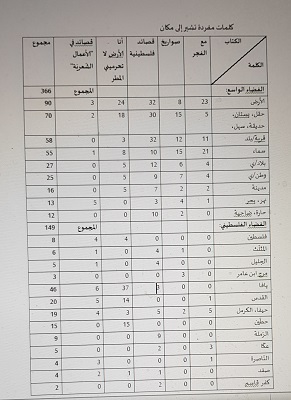 الفضاء الفلسطينيّ: خصَّص الشّاعر 10 قصائد تحمل عناوين لأسماء بلدان فلسطينيّة، وذكرت هذه البلدان 149 مرّة من 942 مرّة وهذا يساوي 16%. (أنظر الملحق رقم 2)