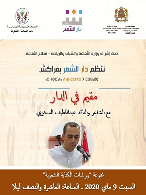 تنظم دار الشعر بمراكش، ليلة السبت 9 ماي 2020، على الساعة العاشرة والنصف ليلا، فقرة "مقيم في الدار"، حيث يحظى مرتفقو ورشات الكتابة الشعرية بلقاء شعري ونقدي مع الشاعر والناقد عبداللطيف السخيري. في حديث خاص، حول الشعر والنقد، وأيضا محاولة للاقتراب من الاشتغال الشعري والنقدي للمبدع المغربي السخيري، والذي سبق أن توج بالعديد من الجوائز من أهمها جائزة الشارقة للإبداع العربي في دورتها الحادية والعشرين في مجال النقد عن كتابه "شعرية التخوم: تنافذ الشعر والنثر في تجربة محمود درويش"..