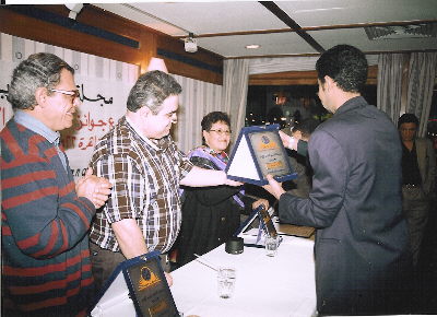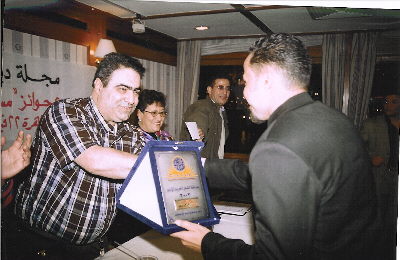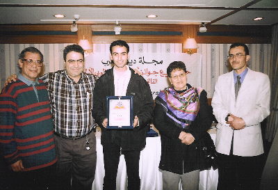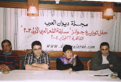 فى أحضان نيل القاهرة العظيم، احتفلت أسرة تحرير مجلة "ديوان العرب" بالفائزين والمشاركين فى مسابقة الشعر العربى الأولى للعام 2003. حضر الاحتفال عضوا لجنة التحكيم المصريان السيدة فريدة النقاش والشاعر حلمي سالم ولم يتمكن العضو الثالث الأستاذ إسماعيل محمود المقيم في الإمارات من المشاركة. كما شارك فى الاحتفال الشاعر أحمد محجوب الفائز بالجائزة الأولى مناصفة مع الشاعر الأردني سيف محاسنة والشاعر الليبي صالح أحمد محمد الرضا الفائز بالجائزة الثانية حيث حضر خصيصا من ليبيا للمشاركة فى الاحتفال. وبسبب وعكة صحية مفاجئة ألمت بها، اعتذرت عن الحضور الشاعرة المصرية لمياء ياسين الفائزة بالمركز الثالث مناصفة مع الشاعرة الفلسطينية أمل إسماعيل، وأنابت عنها شقيقتها د. فاطمة أحمد وزوج شقيقتها الأستاذ أسامة مصطفى لتسلم الجائزة. كما شارك فى الاحتفال الكاتب الفلسطينى الكبير الأستاذ عبد القادر ياسين عضو أسرة تحرير مجلة فلسطين حيث يقيم في مصر. كما شارك فى الاحتفال عدد من الكتاب والشعراء والصحفيين والفنانين المصريين على رأسهم الفنان الكبير محمد ناجى، والكاتب الصحفى الدكتور أحمد الخميسى، والكاتب والشاعر الأستاذ ممدوح الشيخ، والكاتب الموهوب سعيد حجاج. ومن الصحفيين شارك الاستاذ عماد فؤاد محرر بجريدة الأهالى المصرية، والأستاذ منصور عبد الغنى مراسل جريدة أخبار العرب الإماراتية، والصحفى أشرف أنور بجريدة الأسبوع، وطارق الطاهر من جريدة أخبار الأدب، وعمرو رضا من جريدة الجمهورية. كما شارك فى الاحتفال المحامى حلمى الراوى الناشط فى مجال حقوق الإنسان. والباحثة الشابة هبة حسني إمام، إضافة لعدد كبير من الضيوف والأصدقاء.