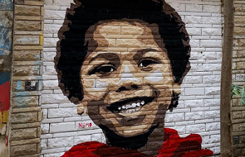 في هذه الجدارية نجده اختار طفلا مبتسما في مواجهة كل الظروف، ركز في لوحته على الوجه مباشرة "بورتريه"، وكانت الخلفية والقاعد جدار حجري وليس اسمنتي فأعطت أشكال الحجر جمالية أخرى للوحة، ورمزية مقصودة حيث ظهرت خطوط الفواصل بين الحجارة عرضيا وطوليا على الوجه، وهذا يشير لحجم تأثيرات الواقع المعاش على الطفل، وقد اختار الفنان الطفل ذو الوجه الأسمر والشعر الأسود الكثيف وجعل خلفية اللوحة بيضاء، فكان التناقض بين اللونين يعطي رمزية لظل الحياة على وجه الطفل، لكن في بؤرة اللوحة كانت الابتسامة التي تظهر أسنان بيضاء مع اللمعة البيضاء على الوجنتين والأنف، مما يعيدنا من جديد إلى الفرح رغم وضوح الفقر على الأسنان غير السليمة والدالة على الفقر، وجرى رسم القميص باللون الأحمر والرقبة تعلوه بلون كما لون الدخان المتصاعد، برمزية للثورة التي تعتمل بداخل هذا الطفل، لكنه لا يفقد الأمل من خلال الابتسامة ولمعة العيون الفرحة وليست البائسة، رغم البؤس الذي تشير اليه كثافة الشعر بدون تزيين وقص وتشذيب منذ فترة طويلة.