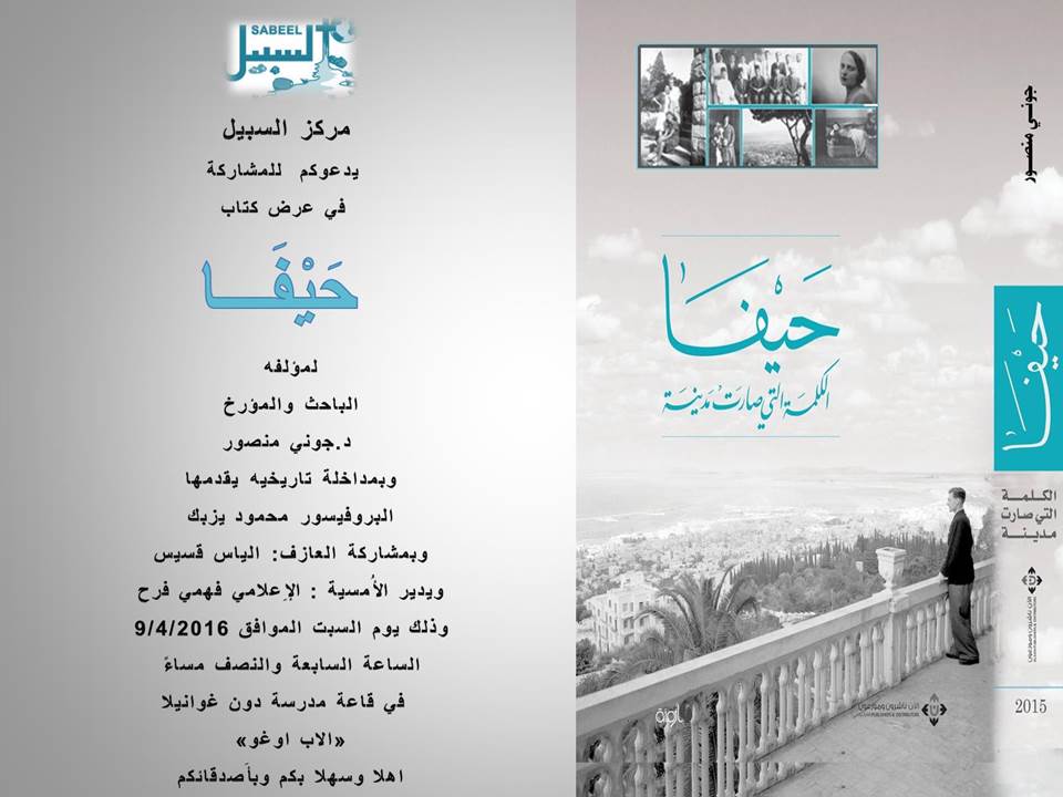 حيث يقدم البروفيسور محمود يزبك مداخلة تاريخية عن حيفا ثم يقدم الدكتور جوني منصور كتابه التوثيقي الذي يعد موسوعة تفصيلية عن حيفا العربية التي شوهها الاحتلال وغير ملامحها، ويشارك في الأمسية الإعلامي فهمي فرح مديرا للأمسية، والعازف إلياس قسيس.