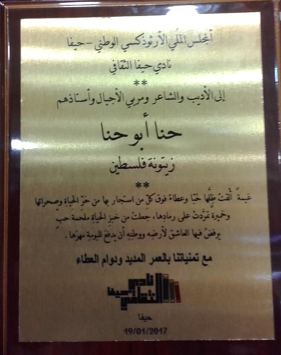 غصّت قاعة كنيسة مار يوحنا المعمدان الأرثوذكسيّة في حيفا بحضور كبير من المُحتفين بشيخنا الأديب حنّا أبو حنّا، وذلك بتاريخ 19-1-2017، في حفل مميّز أقامه نادي حيفا الثقافي برعاية المجلس المِليّ الأرثوذكسيّ الوطنيّ في حيفا. كلمةً ترحيبيّة باسم المجلس الملي الوطنيّ الأرثوذكسيّ في حيفا وباسم نادي حيفا الثقافيّ، افتتح بها الأمسية الاحتفائيّة الأستاذ جريس خوري عضو المجلس المِلّيّ وأمين الصندوق، ، تلتها كلمة المحامي حسن عبادي حول نشاطات نادي حيفا الثقافي المستمرّة وأثرها في المشهد الثقافيّ المحليّ، ثمّ تولّى عرافة الأمسية المحامي فؤاد نقارة مؤسس ورئيس نادي حيفا الثقافيّ، وكانت مداخلات قيّمة لكلّ من د. راوية جرجورة بربارة بعنوان التناصّ الدينيّ مرآة الشاعر حنّا أبو حنّا، ومداخلة الكاتب المُربّي حنّا نور الحاج حول إنتاجه الأدبي، وألقى الشاعر فرحات فرحات نصوص شعريّة من كتابه ريترو تخصّ شيخنا حنّا، وقراءات شعريّة من قصائد حنّا أبو حنّا ألقاها كلّ من: الشاعرة فردوس حبيب الله واليافع مروان محمود سرّيّة، ومداخلات زجلية للزجالين شحادة خوري وحسام برانسي، ثمّ قدّمت له درع تكريم أسرة نادي حيفا الثقافي المؤلفة من الأستاذ جريس خوري والمحامي كميل مويس عضو المجلس المِليّ، والمحامي حسن عبادي عضو نادي حيفا الثقافي والناشط الأدبي، والمحامي فؤاد نقارة، وكذلك أسرة ديوان العرب المؤلفة من الأدباء عادل سالم وآمال عوّاد رضوان قدّمت درع تكريم، والأديبتين د. جهينة خطيب ووالدتها عايدة الخطيب قدّمتا درع تكريم، وكبيرتنا الأديبة سعاد قرمان (أم الطاهر) باقة ورد مغموسة بتاريخ ثقافيّ لا يفنى، ثم ختم اللقاء شيخنا المحتفى به بكلمة متزنة تحمل رسالة للوطن وأمانة التجذّر بالهوية والوطن واللغة العربية، لننتقل إلى التقاط الصور التذكاريّة!