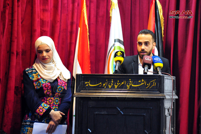 في حين رئيس اتحاد طلبة فلسطين في سورية باسل أبو الهيجا شدد على ضرورة العمل بروح واحدة لبناء مشروع فلسطيني متكامل لمواجهة العدو الصهيوني والانتصار عليه.