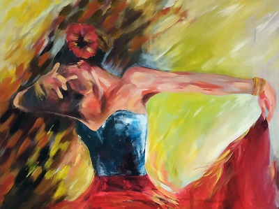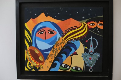 وضمن مشاركتها في معرض ابن احمد، تقدم الفنانة التشكيلة نوعا من الأحلام بألوانها المتمردة التي تتحدى الواقع والمستحيل، هذه المرة، من بعد تكريمها للمرأة الأصيلة في تلك الأرياف البعيدة، ها هي الآن تنصت من جديد لموال عصري، حيث تنبعث المرأة من ثنايا أحلام فاتنة، ومرايا مصقولة بالسحر والدهشة، فترسم على محيا اللوحة رقصة أسطورية تتهادى معها الألوان والتلابيب والمشاعر، فيما شلال الشعر ينهمر وهو منسدلا إلى الخلف بطريقة خرافية، مسافرا إلى اللادرياء، في صورة شاعرية غاية في التمرد والاحتفالية والبحث عن معادل آخر للسعادة.