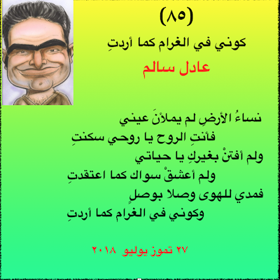 الجمعة ٢٧ تموز (يوليو) ٢٠١٨ بقلم عادل سالم كوني في الغرام كما أردتِ نساء الأرض لم يملأن عيني وأنت الروح يا روحي سكنتِ ولم أفتن بغيرك يا حياتي ولم أعشق سواك كما اعتقدتِ فمدي للهوى وصلا بوصلٍ وكوني في الغرام كما أردتِ