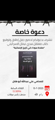 على هامش مؤتمر أدب الحريّة في عمان، تزامناً مع يوم الأسير الفلسطيني، استلم صديقي علي عبد الله أبو هلال نسخاً من إصداره "معتقل سدي تيمان الإسرائيليّ – صفحة سوداء في تاريخ الإنسانيّة" (دراسة، 112 صفحة، تدقيق لغوي: أحمد الصيفي، تصميم: شربل إلياس، الصادرة عن مكتبة كل شيء الحيفاوية لصاحبها وصديقي صالح عباسي، تحت رعاية المكتبة الوطنيّة الفلسطينية ورئيسها آنذاك الصديق عيسى قراقع) وكانت النسخة الأولى من نصيبي.